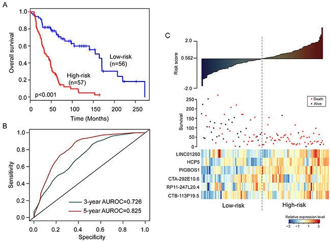 Figure 1: The six-lncRNA signature in the training cohort. (A) Kaplan-Meier survival curves of overall survival between high-risk group and low-risk group. (B) The prediction performance for three- and five-year overall survival by the ROC analysis. (C) Distribution of risk scores, patient survival status and lncRNA expression map.