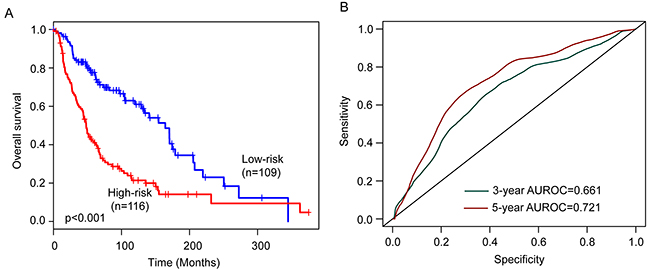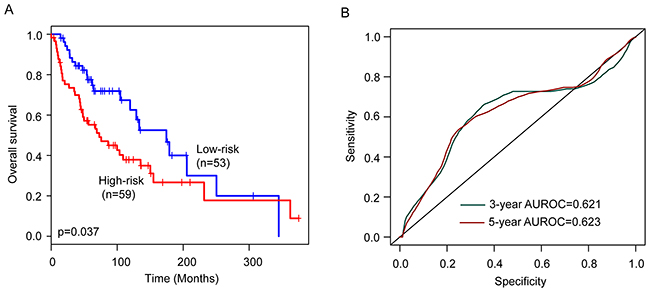 To construct a prognostic signature, the six prognostic lncRNAs were fitted in a multivariate Cox regression analysis in the training cohort. Then a prognostic lncRNA signature with six prognostic lncRNAs was constructed using a mathematical formula for survival prediction according to the expression of the six prognostic lncRNAs and using the multivariate Cox regression coefficient as the weight, as follows: Risk score= (-0.1779* expression value of LINC01260)+(-0.1522*expression of HCP5)+ (0.2537* expression value of PIGBOS1)+(-0.4409*expression of CTA-292E10.6)+ (-0.8444* expression value of RP11-247L20.4)+(-0.2056*expression of CTB-113P19.5). A patient with six-lncRNA signature risk score larger than the median risk score (0.562) was classified as high-risk, whereas patients with risk score six-lncRNA signature risk score smaller than the median risk score (0.562) was classified as low-risk. When the six-lncRNA signature was applied to the training cohort, all patients of the training cohort were divided into the high-risk group (n=57) and low-risk group (n=56) according to the threshold of the median risk score (0.562). Patients in the high-risk group had significantly shorter median survival time than those in the low-risk group (median survival 37.5 months vs. 164.3 months, p<0.001) (Figure 1A). In details, the survival of patients in the low-risk group was 81.8% at 36 months and 77.7% at 60 months which compared with 50.9% and 26.6%, respectively, in the high-risk group. The univariable analysis also revealed a significant association between six-lncRNA signature risk score and overall survival (Table 2). Time-dependent ROC curves were used to assess the prognostic power of the six-lncRNA signature. The AUC of the six-lncRNA signature for survival prediction was 0.726 at 36 months of OS and 0.825 at 60 months of OS.