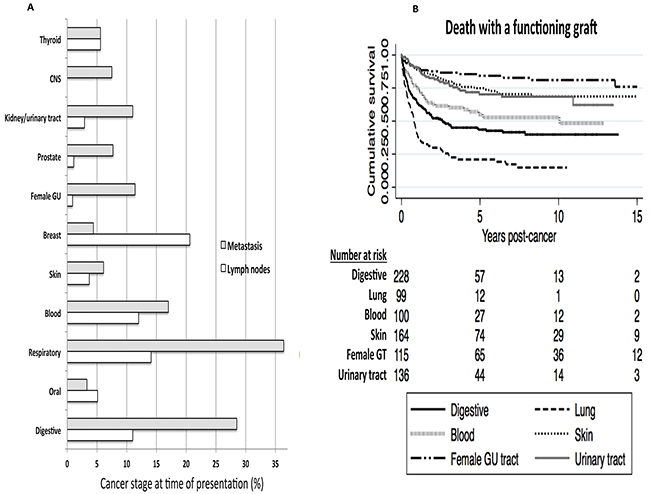 Figure 2: Site-specific cancer types. The proportion of site-specific cancers with advanced stage disease (i.e. lymph nodes involvement or metastatic disease) at time of cancer diagnosis. Lymph node involvement represented by hollow bars and metastatic disease represented by shaded bars. CNS – central nervous system, female GT – female genital tract (A). Kaplan Meier survival curves with number at risk tables for death with functioning graft according to the six common site-specific cancers. Log-rank p<0.01 (B).