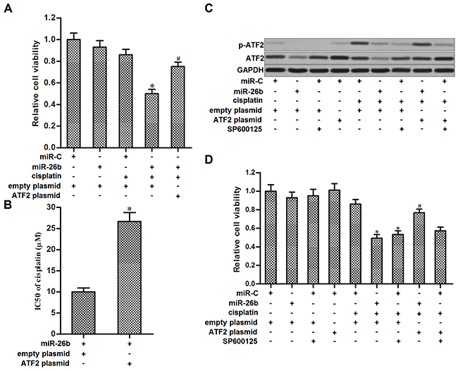 Figure 4: Overexpression of miR-26b sensitized Hep-2/R to cisplatin through inhibiting the phosphorylation of ATF2. (A) Hep-2/R cells were transfected with miR-26b and ATF2 plasmid before treated with cisplatin (10 μM). Cell viability was then measured by using MTT assays. *P<0.05 vs. cisplatin+miR-C+empty plasmid group. #P<0.05 vs. cisplatin+miR-26b+empty plasmid group. (B) Transfection with ATF2 plasmid increased the IC50 of cisplatin to Hep-2/R cells transfected with miR-26b. *P<0.05 vs. miR-26b+empty plasmid group. (C) Effect of cisplatin (10 μM), miR-26b, SP600125 (50 μM) and ATF2 plasmid on influencing the phosphorylation of ATF2 in Hep-2/R. (D) Effect of cisplatin (10 μM), miR-26b, SP600125 (50 μM) and ATF2 plasmid on influencing the cell viability of Hep-2/R. *P<0.05 vs. cisplatin+miR-C+empty plasmid group. #P<0.05 vs. cisplatin+miR-26b+empty plasmid group.