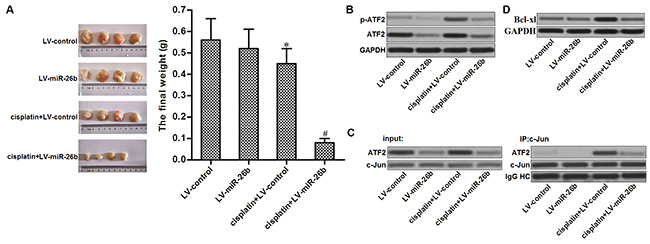 Figure 6: Overexpression of miR-26b reverses cisplatin resistance of Hep-2/R in vivo. (A) Mice were inoculated with miR-26b-overexpressed or control Hep-2/R cells. Subsequently, they were received cisplatin treatment with equal dose (2 mg/kg). The final xenografts were separated and weighted. *P<0.05 vs. LV-control group. #P<0.05 vs. Cisplatin+LV-control group. (B) Cells from xenografts were purified by using collagenase type III. Phosphorylation of ATF2 in these cells was evaluated by western blot analsyis. (C) Interaction with ATF2 and c-Jun in xenograft was evaluated by co-immunoprecipitation assays. (D) Expression of Bcl-xl in xenograft was evaluated by western blot analsyis.