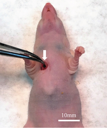 Figure 1: Surgical orthotopic implantation of Ewing’s sarcoma (ES) tumor. A space between the pectoral muscle (white arrow) and intercostal muscle was made in the right chest wall of nude mice for orthotopic implantation of the ES tumor.