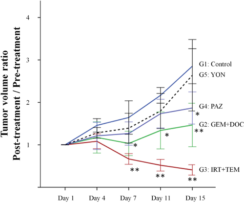 Figure 3: Time course of tumor volume ratio in treated mice compared to untreated control. Line graphs indicate tumor volume ratio (post-treatment volume / pre-treatment volume) on each tumor-measurement day. IRT combined with TEM regressed tumor growth significantly compared to the untreated control group on day 7, 11 and 15 (p<0.001). There was also a significant difference between the untreated control group and the mice treated with the combination of GEM with DOC group on day 7, 11, and 15 (p=0.004, p=0.002, and p=0.001), respectively. PAZ suppressed the tumor growth significantly on day 15 (p=0.001). *P<0.01, **P<0.001 compared to untreated group. Error bars: ± 1 SD.
