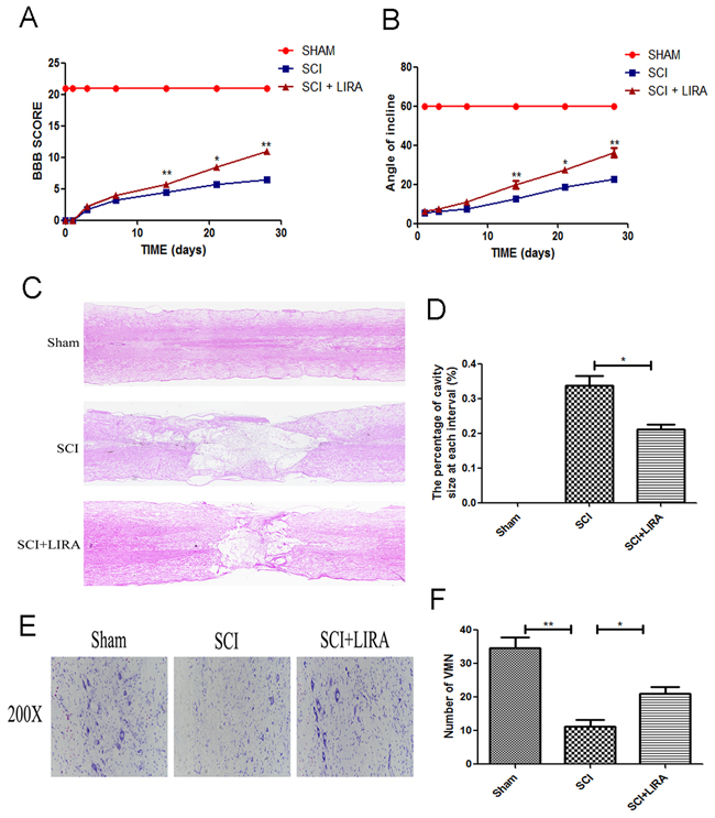Figure 1: Liraglutide decreases the cavity of necrotic tissue as well as the loss of motor neurons and improves functional recovery after SCI. (A) The BBB scores of each group, *P < 0.05 versus the SCI group, **P<0.01, n=5. (B) The inclined plane test scores of each group, *P<0.05 versus the SCI group, **P<0.01, n=5. (C-D) HE staining at 28 days of each group. (E) Nissl staining to assess the loss of neurons at 28 days. (F) Counting analysis of VMN in each group. Graphic presentation of the percent of cavity of necrotic tissue at each interval; columns represent mean ± SD, *P<0.05 versus the SCI group, n=5.