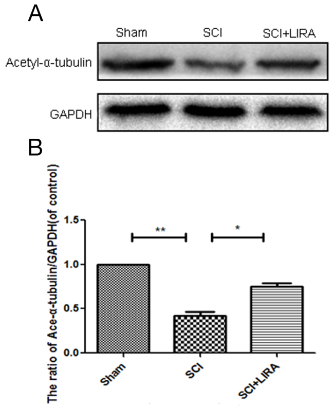 Figure 3: Liraglutide increase microtubule acetylation in acute SCI. (A-B) Representative western blots and quantification data of acetyl-α-tubulin in each group rats at 28 days after sugery.; columns represent mean ± SD, Significant differences between the treatment and sham groups are indicated as *P<0.05, **P<0.01, n=5.