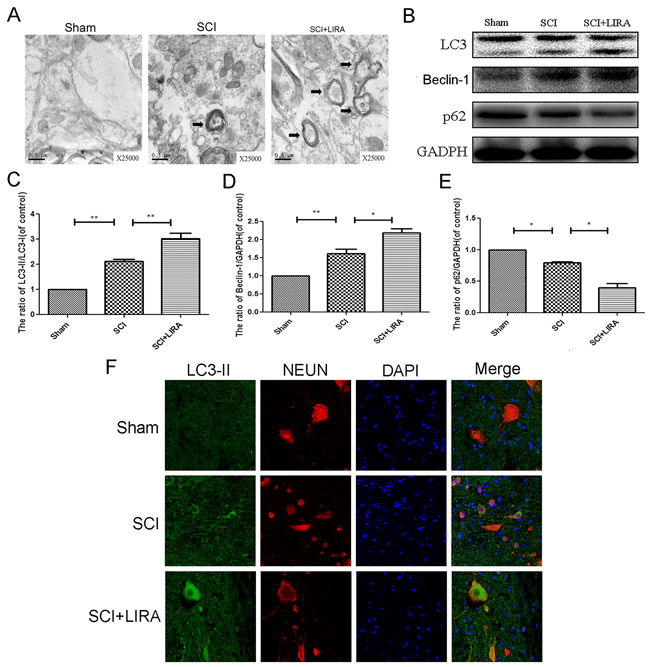While it is known that SCI triggers autophagy activation, the reasoning for this is poorly understood. Using transmission electron microscopy (TEM), we found that increased neuronal autophagosomal vacuoles after SCI and with liraglutide treatment, indicating autophagy activation (Figure 4A). To quantitatively analyze the extent of autophagy induction, we examined known markers of autophagy such as the LC3-II/LC3-I ratio, Beclin-1 and SQSTM1/P62 levels as well as the ratio of p-mTOR/mTOR. As shown in Figure 4B-4E, we found higher ratio of LC3-II/LC3-I and increasing level of beclin-1 in the SCI group compared with the sham group. The ratio of p-mTOR/mTOR and level of p62 decreased, which further supported autophagy activation. However, liraglutide treatment further increased the LC3-II/LC3-I ratio and beclin-1 levels compared with the SCI group. p-mTOR/mTOR ratio and p62 were decreased with liraglutide treatment as well. Similarly, immunofluorescent staining results increased LC3-II positive green dots in the SCI group compared to control sham group, which was exacerbated with liraglutide treatment (Figure 4F).