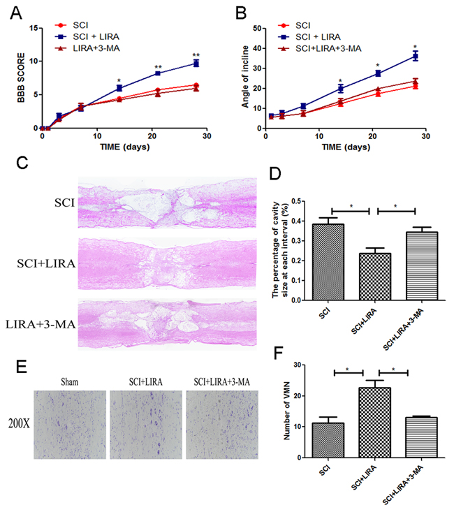 Figure 5: Inhibition of autophagy reversed functional recovery and tissue preservation of liraglutide treatment. (A) The BBB scores of each group, *P < 0.05 versus the SCI group, **P<0.01, n=5. (B) The inclined plane test scores of each group, *P<0.05 versus the SCI group. (C-D) HE staining at 28 days of each group. (E) Nissl staining to assess the loss of neurons at 28 days after surgery. (F) Counting analysis of VMN in each group. Graphic presentation of the percent of cavity of necrotic tissue at each interval; columns represent mean ± SD, Significant differences between the treatment and control groups are indicated as *P<0.05, n=5.