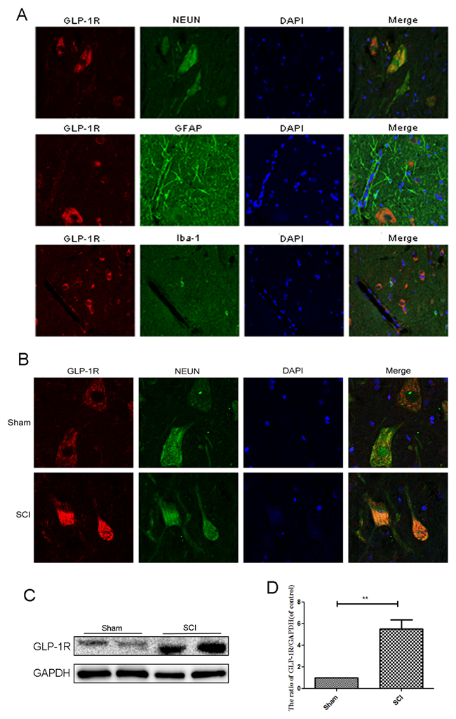 Figure 7: GLP-1R is mainly expressed in neuron in spinal cord tissue and significantly increases after acute SCI. (A) Double immunofluorescence of GLP-1R (red) and NeuN (neuronal marker, green), GFAP (astrocyte marker, green), Iba-1 (microglia marker, green) in sections from the normal spinal cord tissue. (B) Double immunofluorescence of GLP-1R and NeuN in sections from tissue at 1 days after SCI. (C-D) Representative western blots and quantification data of GLP-1R in each group rats; columns represent mean ± SD, Significant differences between the SCI and sham groups are indicated as **P<0.01, n=5.