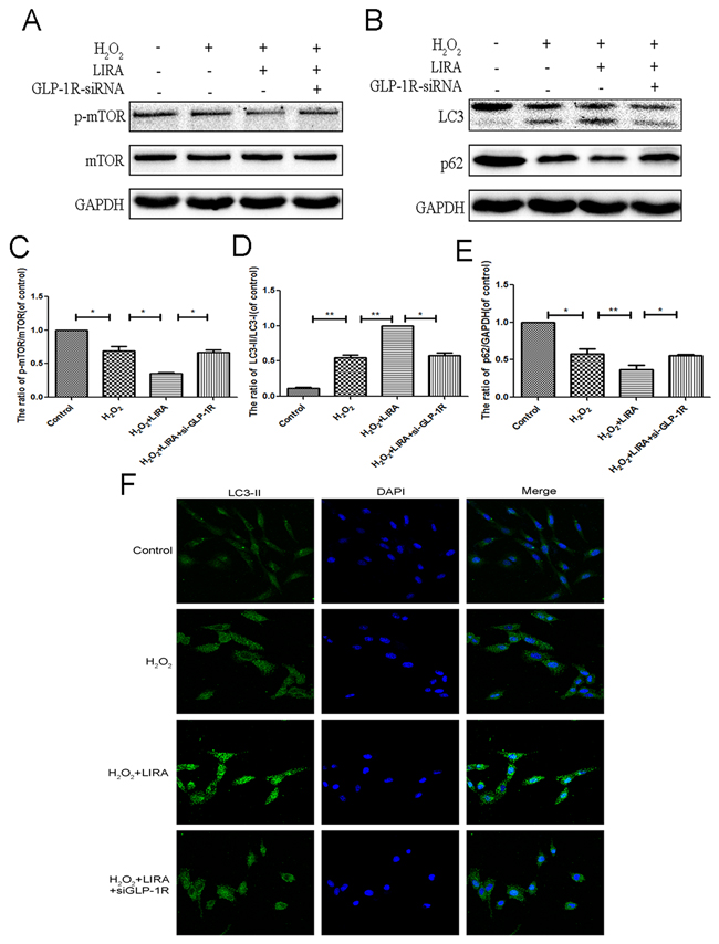 Figure 9: Inhibition of GLP-1R by siRNA markly attenuated liraglutide-induced autophagy and the inhibition of mTOR pathway in PC12 cells under H2O2 stimulation. We planted the cells into the six-well plate, when cells came to the 60–70% confluency, we transfected siRNA. Six hours after transfection, medium was switched to medium with 5% FBS for 24 hours. Cells were pretreated with or without liraglutide for 1 h before the addition of H2O2 (100 μM) for 24 h. (A-E) Representative western blots and quantification data of p-mTOR, mTOR, LC3 and P62 in the PC12 cells as treated above; columns represent mean ± SD, significant differences between the treatment and control groups are indicated as **P<0.01, *P<0.05, n=5. (F) The LC3B (green) was detected by immunofluorescence staining combined with DAPI staining for nuclei in PC12 cells.
