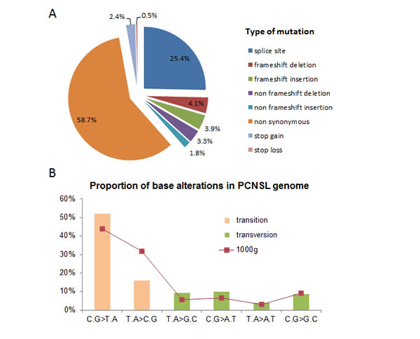Figure 1: Mutation pattern of PCNSL samples investigated by whole exome sequencing. To address PCNSL mutational profile, whole exome sequencing was conducted in nine paired blood and tumor samples. (A) Pie chart represents relative distribution of somatically acquired mutations classified according to their type. (B) Histogram depicts the proportion of PCNSL somatic mutations in each mutational class of transitions and transversions compared with 1000-genomes project data (red line).