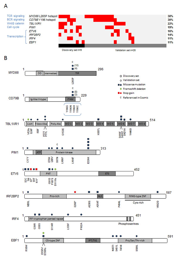 Figure 3: Investigation of 8 relevant genes recurrently affected by point mutations in PCNSL. Based on genes identified by whole exome sequencing, we selected 8 relevant genes to be sequenced in a larger cohort: CD79B, EBF1, ETV6, IRF4, IRF2BP2, MYD88, PIM1 and TBL1XR1. (A) Repartition of validated mutations by gene within the whole population of 37 PCNSL cases. (B) Schematic representation of all validated mutations identified in the discovery (□) and the validation sets (○) with their position according to protein domains. Symbol color indicates mutation type. Number of □ or ○ indicates the number of mutated patients except for L265P MYD88 and Y196 CD79B mutations.