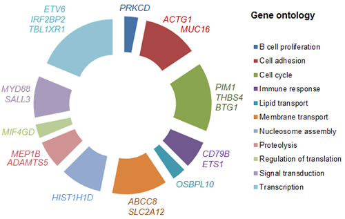 Figure 2: Gene ontology of PCNSL genes. Relative distribution of the 37 genes somatically mutated in PCNSL by gene ontology categories. The spans of the arcs indicate the relative numbers of genes annotated with respect to gene ontology terms. Representative genes in each category are shown next to each arc.