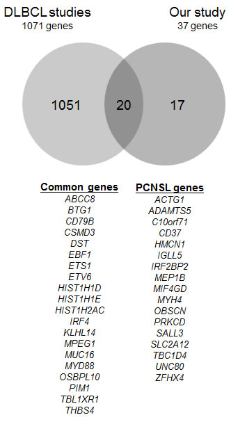 Figure 4: Overlaps in genes discovered in DLBCL studies and our 37 genes of interest. The Venn diagram depicts the comparison between gene mutations from the five DLBCL exomes studies and the present PCNSL study. The gene lists used were as follows: Lohr et al. (Table 1 in Ref. 11, n=72 genes), Pasqualucci et al. (Table S3 and Fig. S4 in Ref. 15, n=108 validated somatic genes), Zhang et al. (Table S3 in Ref. 14, n=322 genes), Morin et al. (in Ref. 9, n=315 known and confirmed somatic genes; Table S3 in Ref. 37, n=588 known and confirmed somatic genes).
