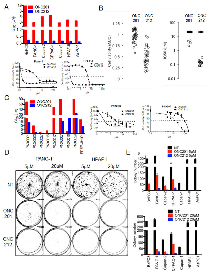 Figure 1: Anti-proliferative effect of imipridones ONC201 or ONC212 against human pancreatic cancer cell lines. A. Effects on cell viability post ONC201 or ONC212 treatment was measured using CellTiter-Glo assay. (Top) Graphs representative of GI50 doses of ONC201 and ONC212 in a panel of seven human pancreatic cancer cell lines. (Bottom) representative dose-response curves of ONC201 and ONC212 in PANC-1 and HPAF-II pancreatic cancer cell lines. B. AUC and IC50 (µM) with 72 hour ONC201 and ONC212 (0.078-20 µM) treatment in a panel of 33 pancreatic cancer cell lines in the GDSC screen. * indicates p < 0.000005. C. (Left) Graphs representative of GI50 doses of ONC201 and ONC212 in nine low-passage patient-derived xenografted (PDX) pancreatic cancer cell lines. (Right) representative dose-response curves of two PDX lines. D. Colony formation assay post ONC201 or ONC212 treatment. Cells were treated with 5 µM or 20 µM of ONC201 or ONC212 for 72 hours and thereafter seeded in triplicate for each condition. Representative images of cells stained with crystal violet on Day 14 are shown. E. Colony number (N = 3) is represented graphically.