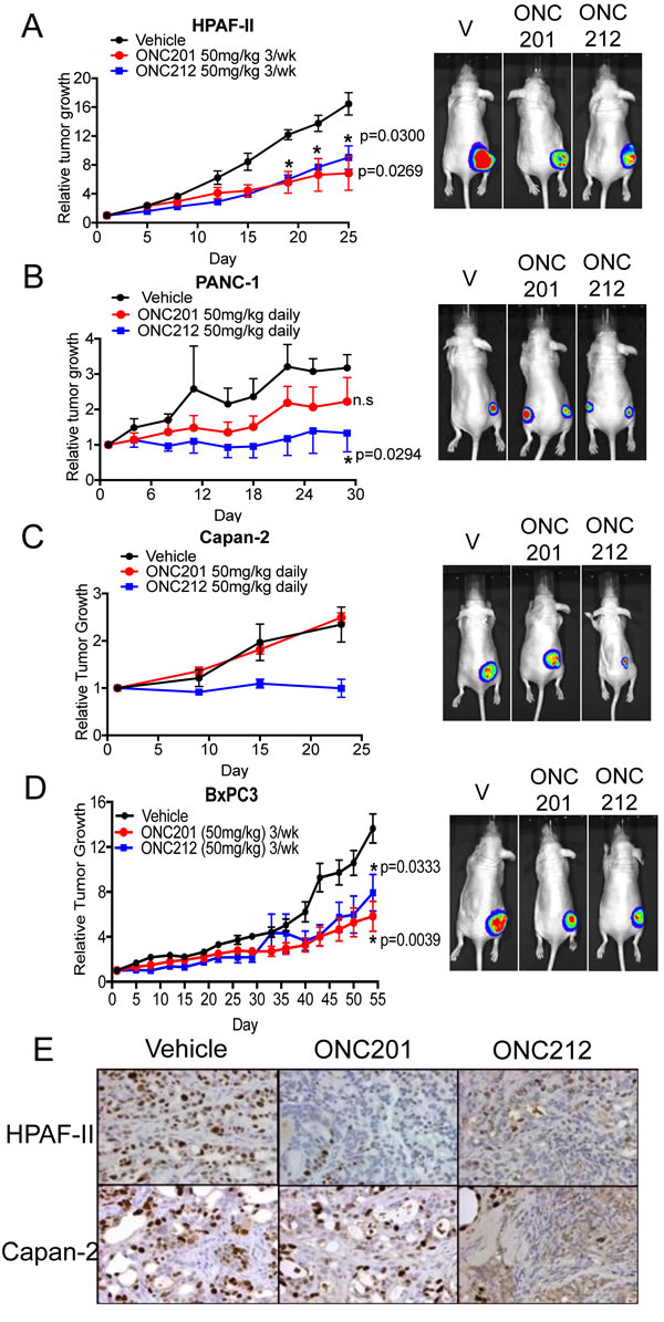 Figure 3: ONC212 shows improved efficacy versus ONC201 in human pancreatic cancer xenograft models. Single-agent efficacy of ONC201 or ONC212 was investigated in four different in vivo models of pancreatic cancer. Doses of 50 mg/kg of either ONC201 or ONC212 were administered either daily (B. PANC-1, C. Capan-2) or three-times a week (A. HPAF-II, D. BxPC3) by oral gavage. (Left, A.-D.). Representative graphs of tumor growth over time. (Right, A.-D.) Bioluminescence imaging was performed at the end of each experiment. Representative bioluminescence images for each treatment cohort. E. Tumor sections from ONC201- or ONC212-treated mice were assessed for the proliferation marker Ki67. Representative Ki67 images of HPAF-II and Capan-2.