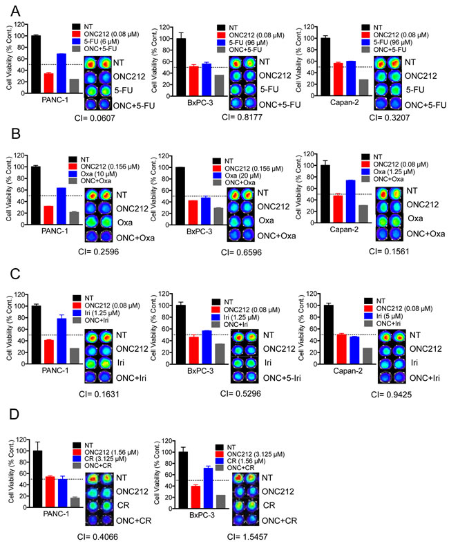 Figure 7: ONC212 shows synergistic anti-cancer activity with 5-fluorouracil, oxaliplatin, irinotecan or crizotinib against human pancreatic cancer cell lines. Combination experiments with 5-fluorouracil (0-384 µM), oxaliplatin (0-20 µM) and irinotecan (0-10 µM) were assayed using resistant cell lines (PANC-1, BxPC3 and Capan 2), with ONC212 given in ranges of 0-5 µM. Chemotherapeutic drug synergy with ONC212 was measured by cell viability 72 hours post-treatment using the CellTiter-Glo assay. (Left, A.-C.) Graphs represent a selected synergistic dose of ONC212 with the indicated drugs. (Right, A.-C.) Corresponding CellTiter-Glo image and CI index for all four cell lines tested. D. PANC-1 and BxPC3 were also treated with combinations of ONC212 (0-100 µM) and crizotinib (0-25 µM). Representative graphs and CI indices of selected combinations and doses of ONC212 and CR are shown.
