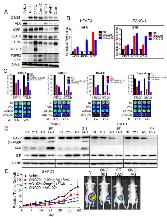 Figure 6: ONC201 and ONC212 show synergistic anti-cancer activity with IGF1-R inhibitor AG1024 in pancreatic cancer cell lines. A. Representative western blot for expression of RTKs assessed from whole cell lysates of seven pancreatic cancer cell lines. B. qRT-PCR analysis of IGF1-R expression over time for the HPAF-II and PANC-1 cell lines, treated with 20 µM ONC201 or ONC212. C. Combination experiments with IGF1-R inhibitor AG1024 (0-25 µM) were assayed in both ONC201/ONC212-sensitive cell line HPAF-II and -resistant cell lines (PANC-1, BxPC3 and Capan 2). ONC201 and ONC212 were used in the ranges of 0-100 µM and 0-50 µM respectively. Synergy for AG1024-ONC201 or -ONC212 combinations was measured by cell viability 72 hours post-treatment using the CellTiter-Glo assay. (Top) Indicated graphs represent a selected synergistic dose of AG1024 and ONC201 or ONC212. (Bottom) CellTiter-Glo image and CI index (Bottom) for all four cell lines tested. D. PANC-1 and BxPC3 were treated with either 20 µM ONC201 or ONC212 or 5 µM AG1024 or combinations as indicated. Representative western blot for markers of apoptosis is shown 72 hours post-treatment. E. Combination efficacy of ONC201 (100 mg/kg, 3/week) and AG1024 (2 mg/kg, 5/week) was investigated in the BxPC3 xenograft model. (Left) Representative graphs of tumor growth over time are shown. (Right) Bioluminescence imaging was performed at the end of the experiment. Representative bioluminescence images for each treatment cohort are shown.