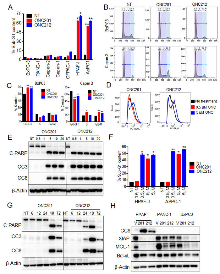 Figure 2: ONC212 induces apoptosis at lower doses and at earlier time point than ONC201 in sensitive cell lines. A. Cell cycle profiles and percentage of apoptotic cells were evaluated in all seven pancreatic cancer cell lines post 20 µM ONC201 or ONC212 treatment. Changes in the sub-G1 phase of the cell cycle are graphically represented. B. Histograms of cell cycle analysis of BxPC3 and Capan-2. C. Quantification of cell cycle phases in BxPC3 and Capan-2 post 20 µM ONC201 or ONC212 treatment. D. Histograms representative of TRAIL-induction in AsPC-1 cells treated with 0.5 µM or 5 µM ONC201 or ONC212 are shown. E. HPAF-II cells were treated with different doses of ONC201 or ONC212. F. The representative percentage of cells in sub-G1 phase is graphically represented. G. HPAF-II and AsPC-1 cells were treated at different durations of time with 5 µM ONC201 or ONC212. Indicated markers of apoptosis were subsequently assessed by western blot analysis. H. Effects on anti-apoptotic markers were measured 72 hours post ONC201 or ONC212 treatment (20 µM) in the indicated cell lines.