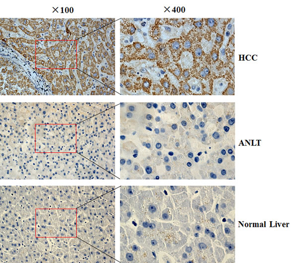 Semi-quantitative RT-PCR results showed that KIF18A was significantly up-regulated in liver cancer tissues compared with ANLT in 16 of 20 (80%) HCC patients (Fig. 1A), while its expression in 8 cases of normal liver tissues from hepatic hemangioma’ surrounding liver tissues was undetectable (Fig. 1B). To confirm RT-PCR results, Real-time PCR analysis was performed to detect KIF18A expression in 216 cases of HCC specimens. Compared with ANLT, KIF18A expression was significantly increased (2–ΔΔCt≥1) in 154 cases (71.3%), but decreased (2–ΔΔCt<1) in 62 cases (28.7%) (P<0.001, Fig. 1C). Interestingly, we found that the increase of KIF18A mRNA expression in HCC tissues (2–ΔΔCt≥1) and the increase of AFP (≥200 ng/ml) in sera from HCC patients were not happened concurrently. Both of them increased in 92 cases (42.6%), AFP alone increased in 27 cases (12.5%) and KIF18A expression alone increased in 62 cases (28.7%) (Fig. 1D). These results indicated that KIF18A might be a candidate of novel biomarker for HCC histology diagnosis. If combining serum AFP and tissue KIF18A expression, HCC diagnosis rate reached more than 80% in our study. We further conducted immunohistochemical assay to detect KIF18A protein in 32 cases of HCC tissues, and found that 21 of 32 (65.6%) cancer tissues had KIF18A positive staining while only 8 of 32 (25.0%) ANLT and none of 8 normal liver tissues from hepatic hemangioma had KIF18A positive staining (Fig. 2).