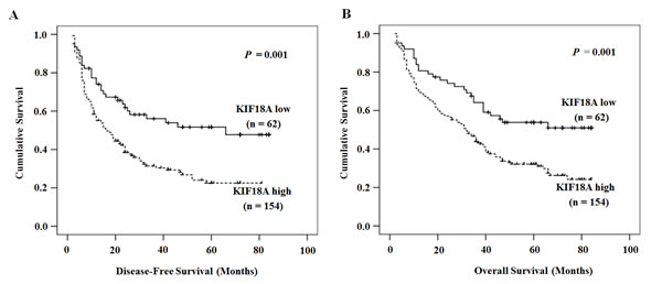 Figure 3: The relationship between KIF18A expression and DFS or OS. Patients with high KIF18A expression had a shorter DFS (A) and OS (B). The solid line represents the patient with low KIF18A expression, whereas the dashed line represents the patients with high KIF18A expression.