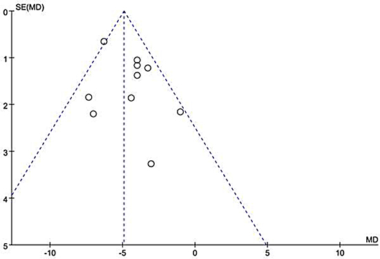 Figure 3: Funnel plot of the 10 included studies. SE = standard error; MD = mean difference.