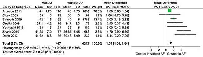 Figure 2: Comparison of LVEF levels between AF and without AF groups in the 10 included studies. CI = confidence interval; AF = atrial fibrillation; LVEF =left ventricular ejection fraction.