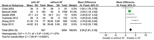 Moreover, The MD in a subgroup analysis for LAD levels between the patients with, and those without NOAF was 1.34 units (95% Cl: 1.04 to 1.64), test for overall effect z-score = 8.75 (p < 0.00001, I2 = 79%) (Figure 4). The heterogeneity test showed that there were significant differences between individual studies (p < 0.00001; I2 = 79%). We subsequently performed sensitivity analyses in order to identify the origin of this heterogeneity [20]. As shown in Figure 5, after excluding the studies by Aronson D et al. [19] the heterogeneity test showed less effects on the results (p < 0.00001, I2 = 57%), whereas the MD in the LAD levels between the patients with and without NOAF was 2.55units (95% Cl: 1.91 to 3.19), test for overall effect z-score = 7.80 (p < 0.00001) . As known, the study by Aronson D et al. [19] had a longer follow-up period of 6 months, which was different from the remaining 6 studies, and this might be a possible source of heterogeneity.