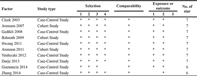 Table 1: Evaluation of the quality of the 10 included studies by using the Newcastle-Ottawa Scale#