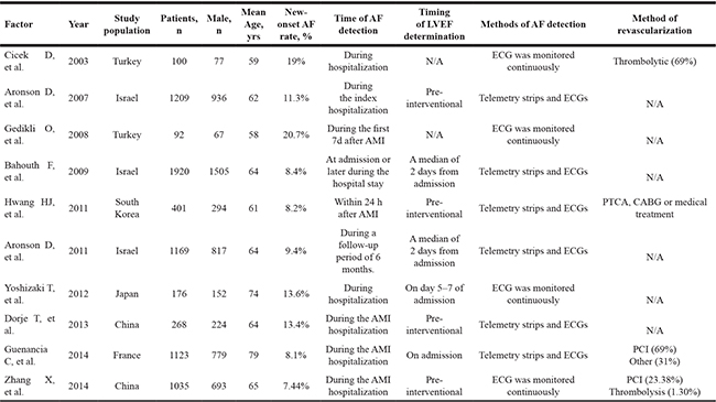 Atrial fibrillation (AF) occurs commonly in hospitalized patients with acute myocardial infarction (AMI), with a reported incidence between 2% and 20% [1], and is closely associated with prolonged hospitalization, increased subsequent cardiovascular mortality in AMI patients [2–6]. The development of AF in the AMI setting is multiple factors, including older age, systemic inflammation, heart failure, acute ischemia, elevated left ventricular (LV) end-diastolic pressure, left atrial (LA) enlargement or infarction [7]. As well known, left ventricular ejection fraction (LVEF) serves as a significant prognostic marker of cardiac function, and left atrium diameter (LAD) responses to whether left atrial enlargement or not, both of those abnormalities are considered as a risk predictor for cardiovascular disease. However, to our knowledge, only a few studies directly evaluated the associations between LVEF or LAD and new-onset AF (NOAF) in patients with AMI. So we conducted this comprehensive meta-analysis to explore the impact of LVEF on NOAF following AMI by collecting data for previously published studies. Furthermore, the relationship of LAD and NOAF was assessed by a subgroup analysis.