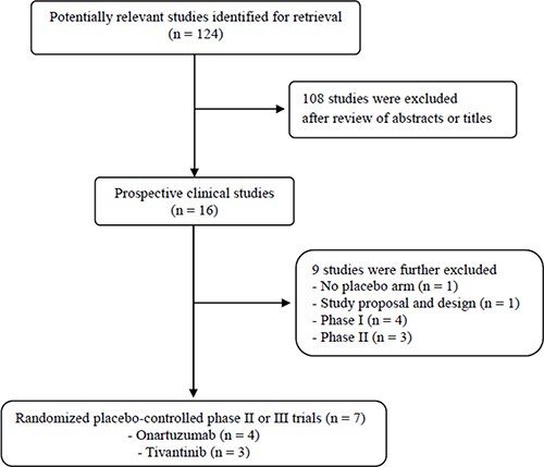 We performed this study according to the Preferred Reporting Items for Systematic Reviews and Meta-Analyses (PRISMA) guidelines [40]. A systematic computerized search of the electronic databases including PubMed, Embase, Google Scholar, and Cochrane Library (up to June 2017) was carried out. The search used the following keywords: “c-Met” or “MET,’ “onartuzumab,” “tivantinib,” “cabozantinib,” “foretinib,” “amuvatinib,” and “lung cancer.” We did not include “crizotinib” because it was approved only for the treatment of ALK-positive NSCLC. The related articles function in PubMed was used to identify all relevant articles.
