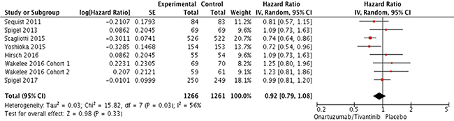 From the seven studies, a total of 2,577 patients were included in the meta-analysis of HRs for progression-free survival (PFS). Compared with the placebo, an additional MET inhibitor was not associated with significantly improved PFS (HR = 0.92 [95% confidence interval (CI): 0.79–1.08], P = 0.33) (Figure 2). There was a significant heterogeneity among studies (X2 = 15.82, P = 0.03, I2 = 56%) and the random-effects model was selected.