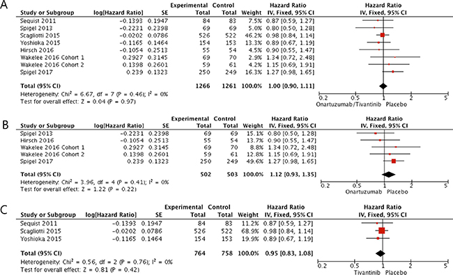 In terms of overall survival (OS), patients who received a MET inhibitor did not show survival benefit compared with those in the placebo group (HR = 1.0 [95% CI: 0.90–1.11], P = 0.97) (Figure 3A). There was no heterogeneity among studies (X2 = 6.67, P = 0.46, I2 = 0%) and the fixed-effects model was adopted. In the subgroup analysis according to drug types, neither onartuzumab (HR = 1.12, [95% CI: 0.93–1.35], P = 0.22) nor tivantinib (HR = 0.95, [95% CI: 0.83–1.08], P = 0.42) showed OS benefit when added to erlotinib or standard chemotherapy (Figure 3B and 3C).