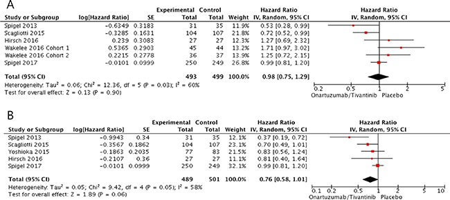 Figure 4: Forest plots of hazard ratios for progression-free survival (A) and overall survival (B) in patients with MET-high NSCLC.
