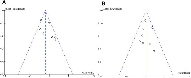 Figure 5: Funnel plots for publication bias regarding progression-free survival (A) and overall survival (B).