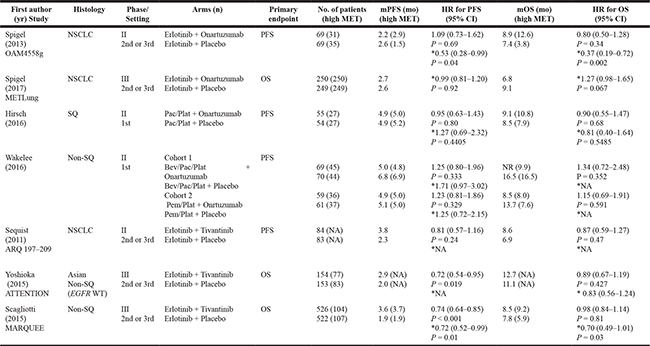 Eligible studies should meet the following inclusion criteria: (i) studies were conducted in patients with NSCLC; (ii) randomized placebo-controlled trial; (iii) randomization of patients to systemic anti-cancer therapy (chemotherapy or targeted therapy) with or without a MET inhibitor. (iii) HRs and 95% CIs for PFS or OS were reported or could be estimated from the data provided; (iv) articles were written in English.
