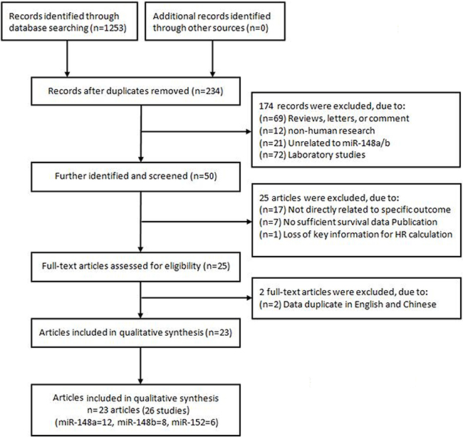 The search process and the final selection of relevant studies are shown in Figure 1 and a total of 1253 studies were identified by cautious searching and screening strategies. After excluding of duplicated studies, the remaining articles were 234. According to the exclusion criteria, 174 articles were further removed based on title or abstract screening. After further identification the individual study. According to the inclusion criteria, 25 articles [21–45] underwent full-text assessment, and two articles [21, 22]were excluded due to data duplication [26, 28]. Finally, a total of 23 articles [23–45] (26 studies), including 12 for miR-148a [23–34], 8 for miR-148b [26, 35–41] and 6 for miR-152 [26, 40, 42–45] respectively were included in evidence synthesis.