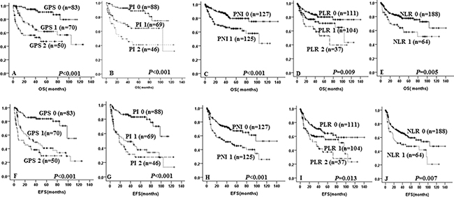 Figure 1: Kaplan-Meier survival curve of overall survival and event-free survival in DLBCL patients according to GPS (A and F), PI (B and G), PNI (C and H), PLR (D and I), NLR (E and J).