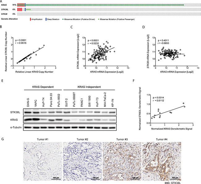Figure 1: STK38L and KRAS expression levels correlate in primary PDACs and PDAC-derived cell lines. (A) Oncoprint summary of KRAS, STK38, and STK38L genomic alterations in the TCGA PDAC cohort. Individual genes are represented by rows, and individual tumors are represented by columns. (B) Correlation analysis of STK38L and KRAS relative linear copy number values. (C) Correlation analysis of STK38L and KRAS mRNA expression (RNA-Seq V2 RSEM). (D) Correlation analysis of STK38 and KRAS mRNA expression (RNA-Seq V2 RSEM) (E) Western blot of STK38L and KRAS protein levels in human-derived PDAC cell lines. Data are representative of two independent experiments. (F) Correlation analysis of STK38L and KRAS protein expression in human-derived PDAC cell lines. (G) Representative images of STK38L immunohistochemical staining (brown) in human PDAC tissue samples at 20× magnification. Cells are counterstained with haematoxylin (blue). Scale bar = 100 μm.