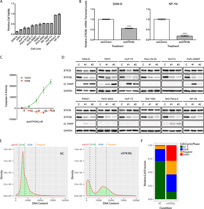 Figure 2: STK38L promotes cell survival in a subset of PDAC cell lines. (A) Assessment of relative cell viability by Alamar Blue assay in a panel of PDAC cell lines 72 h post-transfection with pooled esiRNAs directed against STK38L at 25 nM final concentration. Values are normalized to cells transfected with control esiRNAs. Data are represented as the mean of six technical replicates +/− SEM. (B) RT-qPCR analysis of relative STK38L mRNA transcript levels for DAN-G and KP-1N cells 24 h post-transfection with pooled esiRNAs directed against STK38L. Transcript levels are normalized to the reference gene GAPDH. Data are the mean of three technical replicates +/− SEM. Statistical significance was assessed by Student’s t-test (****−p < 0.0001). (C) Luciferase-based caspase-3-Glo reporter assays of YAPC PDAC cells and H358 lung cancer cells transfected with increasing concentrations of esiSTK38L for 48 h. Arbitrary luminescence units, which are proportional to caspase-3 activity, are plotted on the vertical axis. Data are presented as the means of three replicates +/− SEM. (D) Western blots showing levels of cleaved PARP as an indicator of apoptosis in PDAC cell lines 48 h post-transfection with individual siRNA sequences (#1 and #2) directed against STK38L. GAPDH serves as a gel loading control. (E) Density histogram plots of image cytometry data showing cell counts based on nuclear DNA content, as measured by Hoechst staining, in NC control or siSTK38L transfected DAN-G cells. (F) Relative cell population quantitation based on cell cycle phase, derived by “gating” histograms shown in panel E. All data are representative of two or three independent experiments.