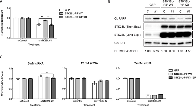 Figure 3: STK38L kinase activity is necessary to promote the survival of DAN-G cells. (A) Cell number quantitation of DAN-G cells stably expressing GFP, HA-STK38L-PIF WT, or HA-STK38L-PIF K119R 48 h post-transfection with a siRNA directed against the 3′-UTR of STK38L at 6 nM final concentration. Data are the mean of five technical replicates +/− SEM. Statistical significance was assessed by one-way ANOVA with Tukey’s test for post-hoc validation (**−p < 0.01). (B) Western blot analysis of cleaved PARP levels following siRNA-mediated depletion of STK38L in DAN-G cells stably expressing GFP, HA-STK38L-PIF WT, or HA-STK38L-PIF K119R. GAPDH serves as a gel loading control. Protein band (cleaved PARP to GAPDH ratio) densitometric quantification values are indicated at the bottom. (C) Quantitation of DAN-G cells stably expressing GFP, HA-STK38L-PIF WT, or HA-STK38L-PIF K119R 48 h post-transfection with a siRNA directed against the coding sequence of STK38L. Data are the mean of five technical replicates +/− SEM. Statistical significance was assessed by one-way ANOVA with Tukey’s test for post-hoc validation (**−p < 0.01).