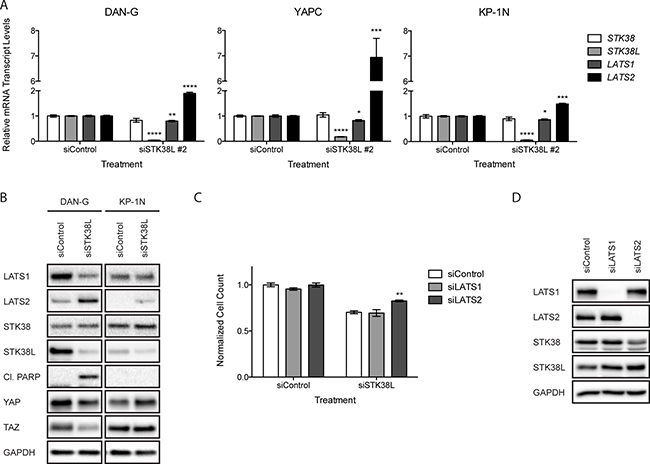 Figure 5: Increased LATS2 expression following STK38L depletion contributes to cytotoxicity. (A) RT-qPCR analysis of relative mRNA transcript levels in DAN-G, YAPC, and KP-1N cells 24 h post-transfection with a single siRNA directed against STK38L (siSTK38L #2). Transcript levels are normalized to the reference gene GAPDH. Data are the mean of three technical replicates +/− SEM. Statistical significance was assessed by Student’s t-test (* -p < 0.05; **−p < 0.01; ***−p < 0.001; ****−p < 0.0001). (B) Western blot analysis of DAN-G and KP-1N cells 48 h post-transfection with siSTK38L #2. GAPDH serves as a gel loading control (C) Quantitation of DAN-G cell numbers 48 h post-transfection with siRNAs directed against LATS1 or LATS2 plus control siRNA or in combination with siSTK38L. Data are the mean of fifteen technical replicates +/− SEM and are representative of two independent experiments. Statistical significance was assessed by one-way ANOVA with Dunnett’s test for post-hoc validation (**−p < 0.01). (D) Western blot analysis of DAN-G cells 48 h post-transfection with pooled siRNAs directed against LATS1 and LATS2. GAPDH serves as a gel loading control.