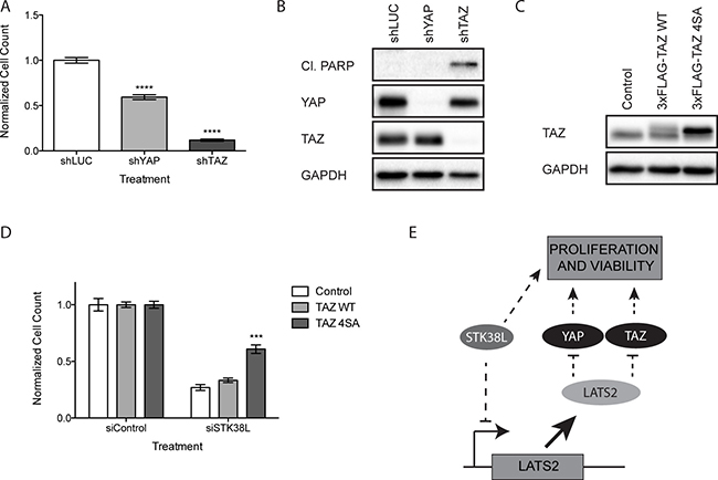 Figure 6: Loss of TAZ induces apoptosis in DAN-G cells. (A) Quantitation of DAN-G cell numbers 72 h post-transduction with shRNAs directed against luciferase (shLUC), YAP (shYAP) or TAZ (shTAZ). Data are the mean of twelve technical replicates +/− SEM and are representative of two independent experiments. Statistical significance was assessed by one-way ANOVA with Dunnett’s test for post-hoc validation (****−p < 0.0001). (B) Western blot analysis of DAN-G cells 72 h post-transduction with lentiviral shRNA expression vectors directed against luciferase, YAP, or TAZ. GAPDH serves as a loading control. (C) Western blot analysis of DAN-G cells stably expressing an empty vector Control, 3xFLAG-TAZ WT, or 3xFLAG-TAZ 4SA. Both endogenous (lower band) and 3xFLAG-tagged exogenous (upper band) TAZ are shown. GAPDH serves as a gel loading control. (D) Quantitation of DAN-G cells stably expressing an empty vector Control, 3xFLAG-TAZ WT, or 3xFLAG-TAZ 4SA 48 h post-transfection with a siRNAs directed against STK38L at 25 nM final concentration. Data are the mean of eighteen technical replicates +/− SEM and are representative of two independent experiments. Statistical significance was assessed by one-way ANOVA with Dunnett’s test for post-hoc validation (***−p < 0.001). (E) Schematic representation of STK38L-mediated control of cellular proliferation and viability via suppression of LATS2 expression and concomitant activation of parallel survival pathways.