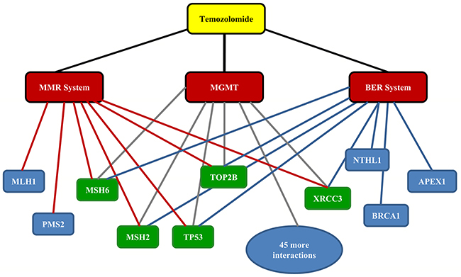 Figure 1: Drug-target protein interaction network of temozolomide. Five protein targets (in green) in common among three DNA repair systems were identified using STRING : MSH2, MSH6, XRCC3, TOP2B and TP53. MGMT: methylguanine methyltransferase. MMR: mismatch repair. BER: base excision repair.