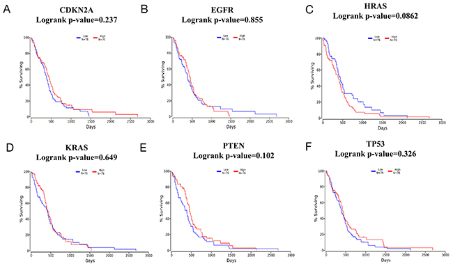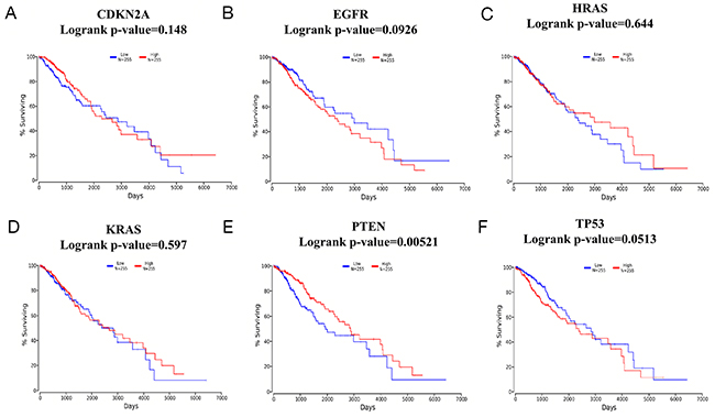 Figure 7: Survival analysis according to CDKN2A/EGFR/HRAS/KRAS/PTEN/TP53 mRNA expression in glioblastoma multiforme (GBM) (A-F). A total of 152 GBM samples were included in the OncoLnc database and classified according to the meanvalue of the mRNA expression level. Blue lines indicate lower mRNA expression levels, while red lines indicate higher mRNA expression levels.