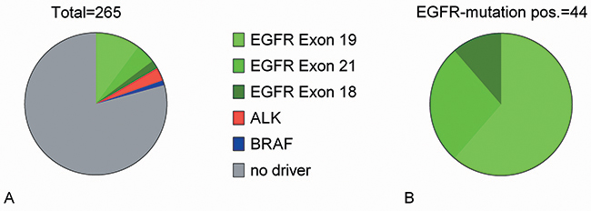 EGFR-mutation testing has been performed since June 2009. EGFR testing was done from tumor biopsies with at least 20% tumor-cell content using micro-dissection of tumor cells, PCR, and Sanger sequencing of exons 18, 19, and 21 of the EGFR gene. Since January 2015, also exon 20 has been tested. With the availability of the third-generation EGFR-TKI osimertinib, patients with EGFR-TKI sensitive NSCLC and acquired resistance to 1st/2nd generation EGFR-TKI therapy with an accessible progressive lesion were re-biopsied for molecular pathological workup with a focus on detection of the T790M-resistance mutation in exon 20. In one case, liquid biopsy was used for molecular pathological workup [69].