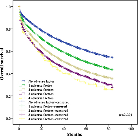 Furthermore, we evaluated the effect of female sex, age, differentiation level, tumor site (right colon vs left colon, rectum vs colon) and AJCC staging on survival of colorectal cancer in the five groups. The data showed that sex, age, differentiation level, and AJCC staging still exert significant effect on the survival of CRC patients in these groups except in the four-adverse-factor group.