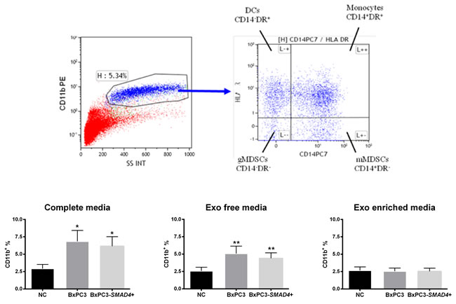 Figure 1: BxPC3 and BxPC3-SMAD4+ CM expand CD11b+ immature myeloid cells. Upper panels: Representative CD11b gating in flow cytometry (upper left panel) and subsequent analysis of CD11b+ cells on the basis of CD14 and HLA-DR expression (upper right panel). DCs: Dendritic cells (CD11b+CD14-HLA-DR+); gMDSCs (CD11b+CD14-HLA-DR-) and mMDSCs (CD11b+CD14+HLA-DR-): granulocytic and monocytic myeloid derived suppressor cells; Monocytes (CD11b+CD14+HLA-DR+). Bottom panels: CD11b+ immature myeloid cells counted after incubating PBMCs for four days with complete, Exo free and Exo enriched BxPC3 (dark grey columns) or BxPC3-SMAD4+ (light grey columns) conditioned media. PBMCs were always run in parallel in complete, Exo free and Exo enriched non-conditioned medium (NC, black columns). All data are given as average values ± SEM obtained for 8 donors * = p<0.05 and ** = p<0.01 with respect to NC (Tukey’s multiple comparisons test).