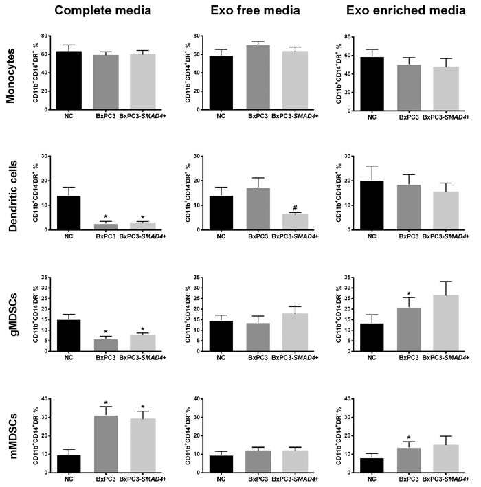 Figure 2: BxPC3 derived Exo expand myeloid derived suppressor cells. Monocytes, dendritic cells, granulocytic and monocytic derived suppressor cells (gMDSCs and mMDSCs) were counted after PBMCs were incubated for four days with complete, Exo free and Exo enriched BxPC3 (dark grey columns) or BxPC3-SMAD4+ (light grey columns) conditioned media (CM). PBMCs were always run in parallel in complete, Exo free and Exo enriched non-conditioned medium (NC, black columns). All data are given as the average values ± SEM obtained from eight donors * = p<0.05 with respect to NC and # = p<0.05 with respect to NC and BxPC3 (Tukey’s multiple comparisons test).