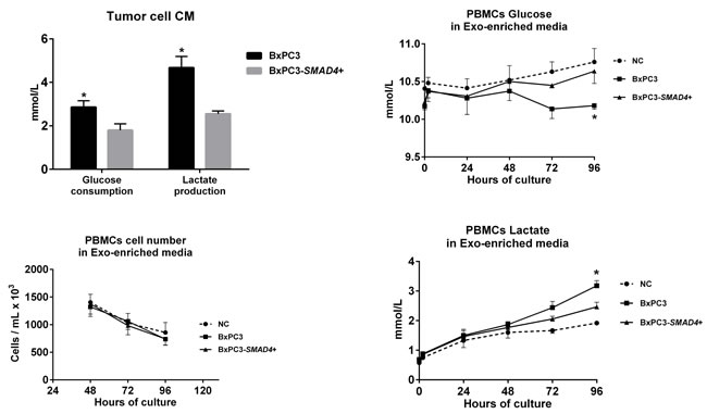 Figure 7: PDAC-derived Exo induce aerobic glycolysis in PBMCs. Upper left panel: Glucose consumption and lactate production of BxPC3 and BxPC3-SMAD4+ cells (mean with standard deviation). The cells were cultured for 4 days in complete media 1% FCS to obtain conditioned media (CM). Glucose and lactate were measured in non conditioned and in CM from three separate experiments. For any experiment glucose consumption was calculated as the difference between glucose measured in non conditioned (11.5 mmol/L, mean of three replicates) and in CM. In non conditioned media lactate levels were always below the detection limit (<0.03 mmol/L), this supporting lactate levels measured in CM as lactate production. *Student’s t test for paired data: t = 12.95, p<0.01 for glucose consumption; t = 9.54, p = 0.01 for lactate production. Lower left panel: number of PBMCs cultured in Exo-enriched non conditioned (NC) medium and in Exo-enriched BxPC3 and BxPC3-SMAD4+ CM obtained as described in the upper left panel. Mean values (points) with standard deviation (bars) from three independent experiments, each in duplicate, are shown. Two-way Repeated measures analysis of variance: F = 14.16, p = 0.0012 for time effect; F = 0.72, p = 0.5101 for treatment effect; F = 0.2287, p = 0.9190 for time-treatment interaction. Upper and lower right panels: glucose and lactate measured in the supernatants of PBMCs cultured for 2, 24, 48, 72 and 96 hours in Exo-enriched NC and in Exo-enriched BxPC3 and BxPC3-SMAD4+ CM obtained as described in the upper left panel. Mean values (points) with standard deviation (bars) from three independent experiments, each in duplicate, are shown. Two-way Repeated measures analysis of variance: Time effect: F = 0.9175, p = 0.5077 for glucose and F = 49.68, p<0.0001 for lactate; Treatment effect: F = 9.943, p = 0.0280 for glucose and F = 10.11, p = 0.0273 for lactate; Time-treatment interaction: F = 2.420, p = 0.0444 for glucose and F = 8.997, p<0.0001 for lactate. *Tukey’s multiple comparison test: p < 0.05 with respect to NC PBMCs.