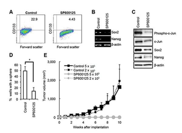 Figure 1: Pharmacological inhibition of JNK by SP600125 causes loss of the self-renewal and tumor-initiating capacity in PANC-1 CSLCs. (A) PANC-1 CSLCs cultured in the absence (Control) or presence of 30 μM SP600125 for 6 days were subjected to flow cytometric analysis for the cell surface expression of CD133. Representative flow cytometric plots together with the percentages of CD133-positive cells are shown. (B and C) PANC-1 CSLCs cultured as in (A) were subjected to RT-PCR (B) and immunoblot (C) analyses of the indicated mRNAs or proteins. (D) PANC-1 CSLCs cultured as in (A) were subjected, after washout of the inhibitor, to the sphere formation assay in the absence of SP600125. The graph shows the percentage of wells in which a tumorsphere has been formed from a single cell, and the data represent means + SD from 3 independent experiments. (E) Mice (3 for each group) were implanted subcutaneously with the indicated numbers of viable PANC-1 CSLCs that had been treated with or without SP600125 as in (A). Tumor volumes were measured at the indicated time points after implantation, and the results are presented in the graph as the means + SD.